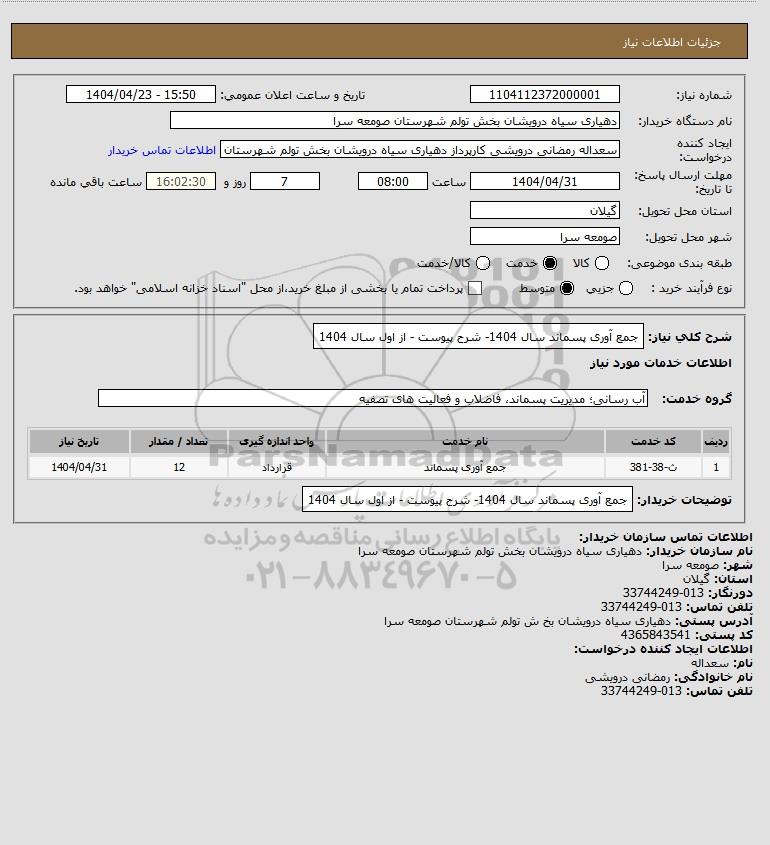 عنوان آگهی: استعلام جمع آوری پسماند سال 1404- شرح پیوست - از اول سال 1404
