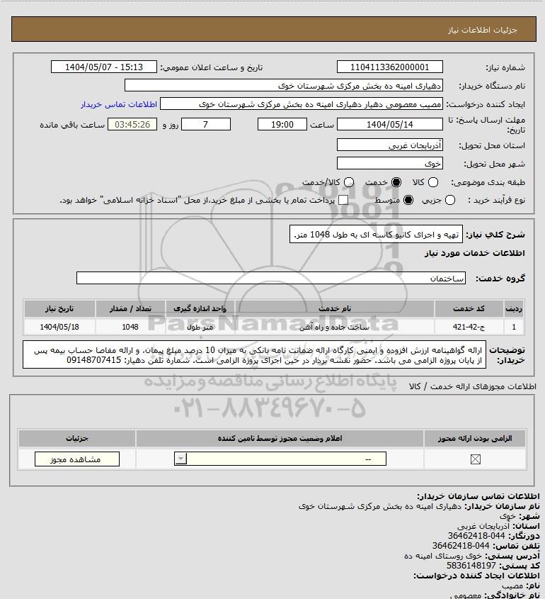 تلفن:5- 88349670 (021) فکس: 88349673 (021) Website: www.ParsNamadData.com E-mail: Info@ParsNamadData.com استعلام تهیه و اجرای کانیو کاسه ای به طول 1048 متر.