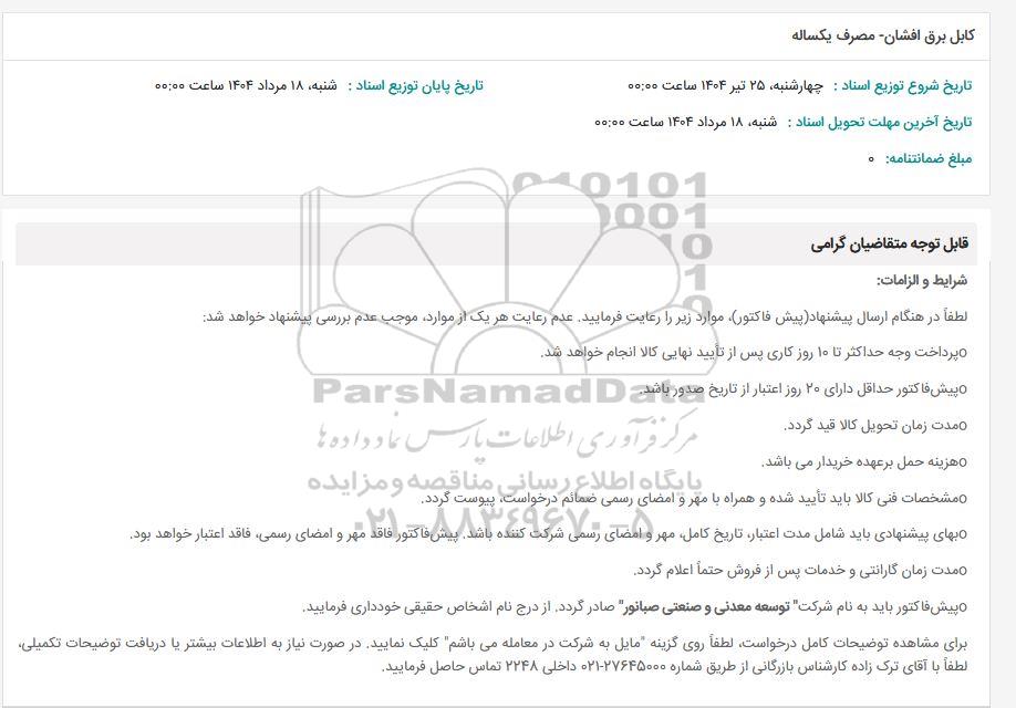 | عنوان آگهی: استعلام کابل برق افشان مصرف یکساله |