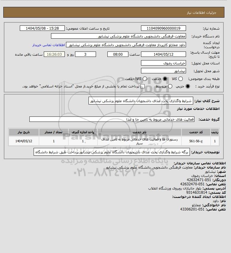 شرایط واگذاری پخت غذای داشجویان دانشگاه علوم پزشکی نیشابور