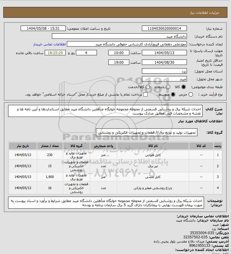 تلفن:5- 88349670 (021) فکس: 88349673 (021) Website: www.ParsNamadData.com E-mail: Info@ParsNamadData.com استعلام احداث شبکه برق و روشنایی قسمتی از محوطه مجموعه خوابگاه متأهلین دانشگاه میبد مطابق استانداردها و آیین نامه ها و نقشه و مشخصات فنی مطابق مدارک پیوست