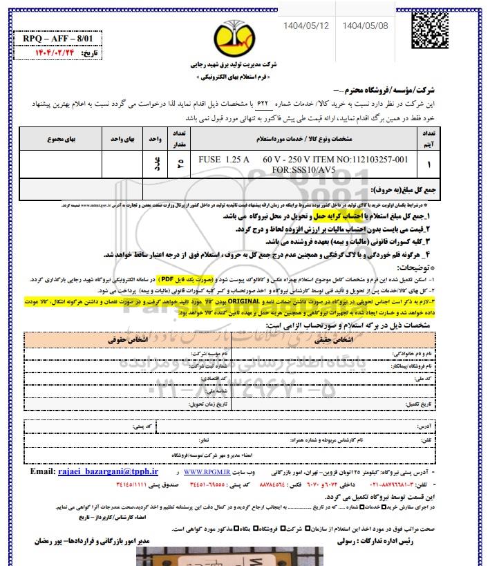 1- اسکن تکمیل شده این فرو مشخصات کامل موضوع استعلام به همراه عکس و کاتالوگ پیوست شود (بصورت یک فایل PDF) در سامانه الکترونیکی نیروگاه شهید رجایی بارگذاری گردد.