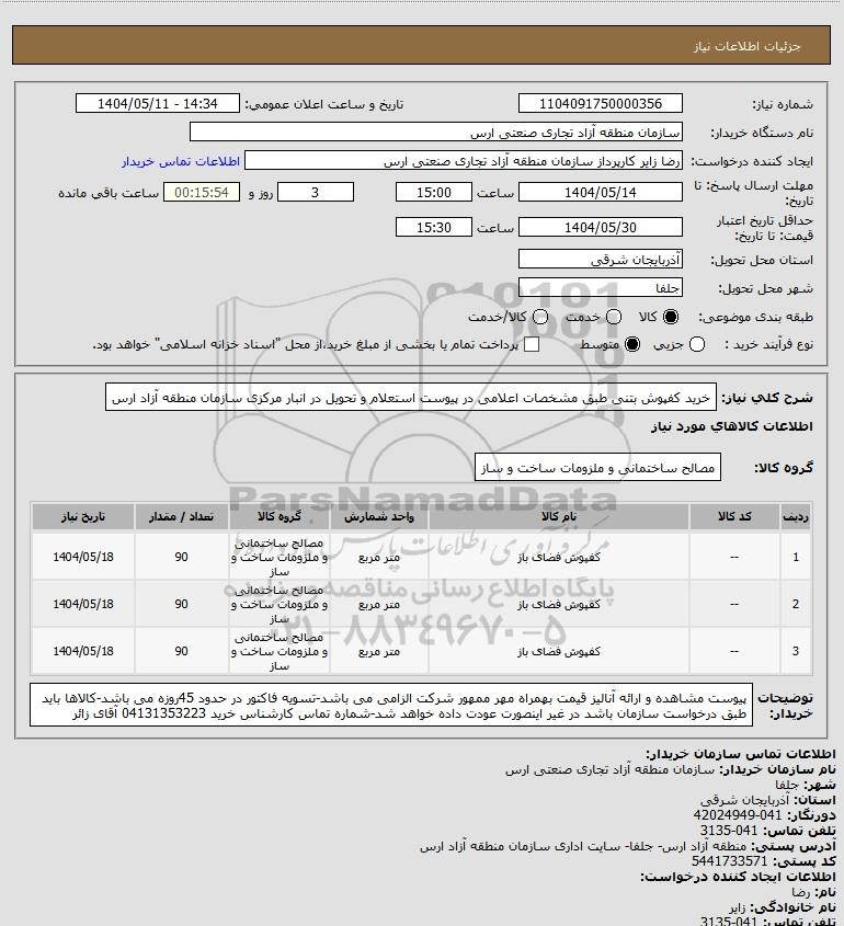 تلفن:5- 88349670 (021) فکس: 88349673 (021) Website: www.ParsNamadData.com E-mail: Info@ParsNamadData.com استعلام خرید کفپوش بتنی طبق مشخصات اعلامی در پیوست استعلام و تحویل در انبار مرکزی سازمان منطقه آزاد ارس
