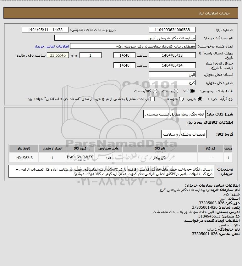 تلفن:5- 88349670 (021) فکس: 88349673 (021) Website: www.ParsNamadData.com E-mail: Info@ParsNamadData.com استعلام لوله ولگن بیمار مطابق لیست پیوستی