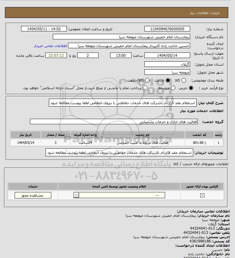 تلفن:5- 88349670 (021) فکس: 88349673 (021) Website: www.ParsNamadData.com E-mail: Info@ParsNamadData.com استعلام استعلام عقد قرارداد باشرکت های خدمات حفاظتی با نیروی انتظامی لطفا پیوست مطالعه شود