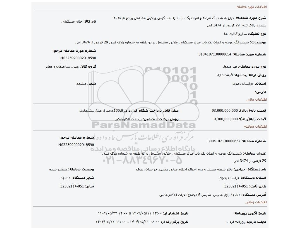 | شماره معامله: 3004107130000657 | | شماره معامله مرجع: 140325920002918590 | | عنوان معامله: ششدانگ عرصه و اعیان یک باب منزل مسکونی ویلایی مشتمل بر دو طبقه به شماره پلاک ثبتی 29 فرعی از 3474 اص | | نام دستگاه اجرایی: دفتر شعبه بیست و دوم اجرای احکام مدنی مشهد خراسان رضوی | | وضعیت معامله: منتشر شده | | استان دستگاه: خراسان رضوی | | شهر دستگاه: مشهد | | تلفن ثابت: 051-32302114 | | نمابر: 051-32302114 | | آدرس دستگاه: مشهد-بلوار مدرس -مدرس 6 مجتمع اجرای احکام مدنی |