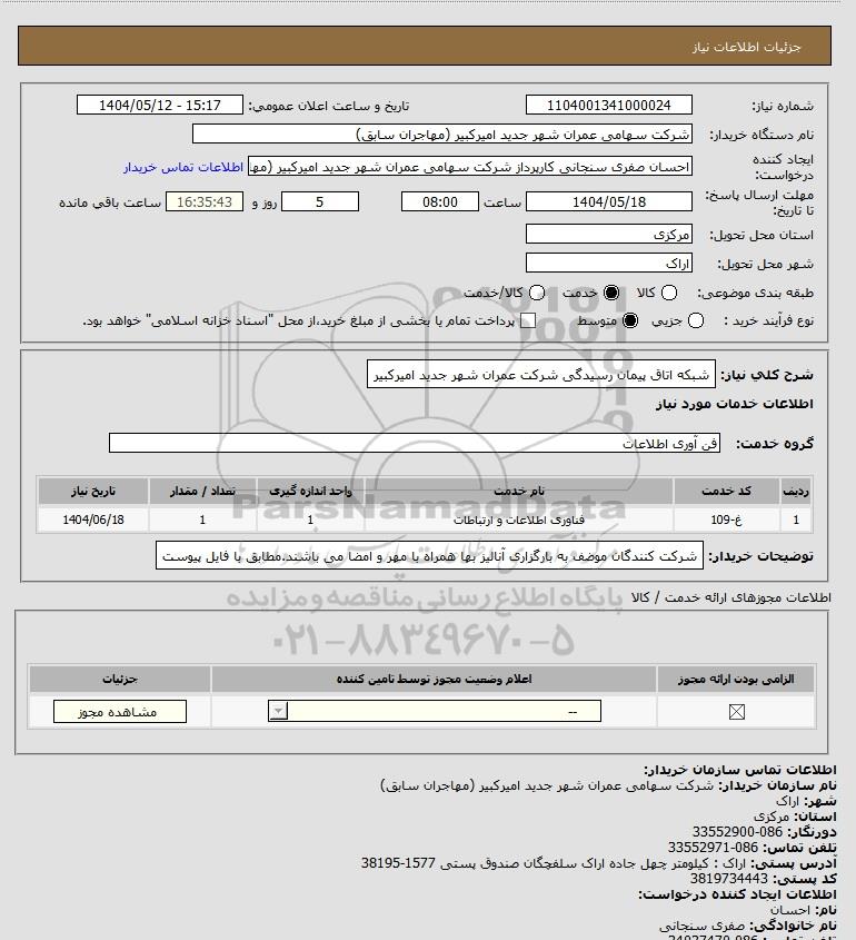 تلفن:5- 88349670 (021) فکس: 88349673 (021) Website: www.ParsNamadData.com E-mail: Info@ParsNamadData.com استعلام شبکه اتاق پیمان رسیدگی شرکت عمران شهر جدید امیرکبیر