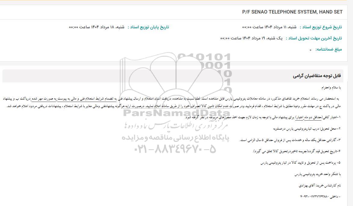 | عنوان آگهی: استعلام P/F SENAO TELEPHONE SYSTEM , HAND SET |