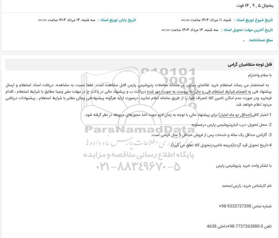 به استحضار می رساند استعلام خرید تقاضای مذکور در سامانه معاملات پتروشیمی پارس قابل مشاهده است. لطفا نسبت به مشاهده دریافت اسناد استعلام و ارسال پیشنهاد فنی به انضمام شرایط استعلام فنی و مالی به پیوست به صورت مهر شده در پاکت ب و پیشنهاد مالی در پاکت ج در مهلت مقرر وعينا مطابق با شرایط استعلام ، اقدام فرمایید و در صورت عدم امکان تامین کالا انصراف خود را از طریق سامانه اعلام نمایید در صورت ارایه هرگونه پیشنها دفنی و مالی مغایر با شرایط استعلام ، پیشنهادات دریافتی مردود اعلام خواهد شد.