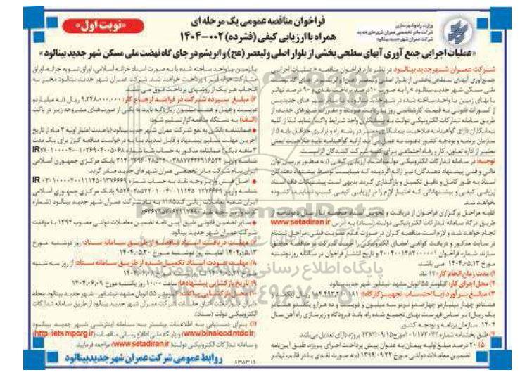 فراخوان مناقصه عمومی یک مرحله ای همراه با ارزیابی کیفی (فشرده) شماره 002-1404 نوبت اول