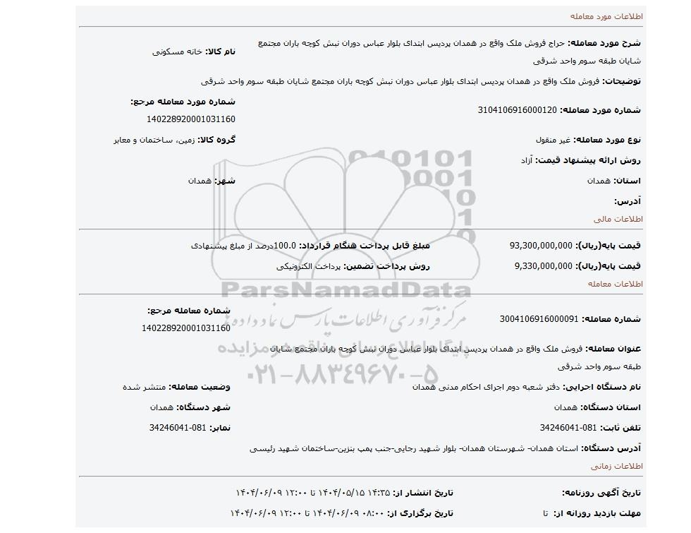 مزایده فروش ملک واقع در همدان پردیس ابتدای بلوار عباس دوران نبش کوچه باران مجتمع شایان طبقه سوم واحد شرقی