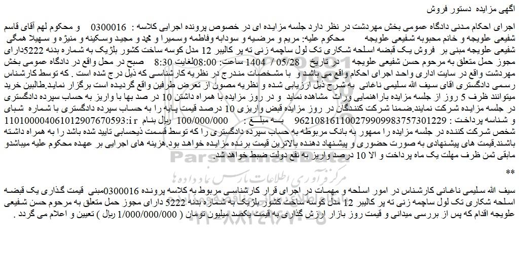اجرای احکام مدنی دادگاه عمومی بخش مهردشت در نظر دارد جلسه مزایده ای در خصوص پرونده اجرایی کلاسه : 0300016 و محکوم لهم آقای قاسم شفیعی علویجه و خانم محبوبه شفیعی علویجه محکوم علیه: مریم و مرضیه و سودابه وفاطمه وسمیرا و محمد و مجید وسکینه و منیژه و سهیلا همگی شفیعی علویجه مبنی بر فروش یک قبضه اسلحه شکاری تک لول ساچمه زنی ته پر کالیبر 12 مدل کوسه ساخت کشور بلژیک به شماره بدنه 5222دارای مجوز حمل متعلق به مرحوم حسن شفیعی علویجه در تاریخ 05/28 / 1404 ساعت: 08:00لغایت 8:30 صبح در محل واقع در دادگاه عمومی بخش مهردشت واقع در سایت اداری واحد اجرای احکام واقع می باشد و با مشخصات مندرج در نظریه کارشناسی که ذیل درج شده است . که توسط کارشناس رسمی دادگستری اقای سیف الله سلیمی ناغانی به شرح ذیل ارزیابی شده و نظریه مصون از تعرض طرفین واقع گردیده است برگزار نماید.طالبین خرید میتوانند ظرف 5 روز از جلسه مزایده باراهنمایی وراث مشاهده نماید و در روز مزایده با همراه داشتن 10 در صد بها با واریز به حساب سپرده دادگستری در جلسه مزایده شرکت نمایند.ضمنا شرکت کنندگان در روز مزایده قبض واریزی 10 درصد قیمت پایه را به حساب سپرده دادگستری با شماره شبای :110100004061012907670593ir و شناسه پرداخت : 962108161100279909983757301229 به مبلغ : 100/000/000 ریال بنام شخص شرکت کننده در جلسه مزایده را ممهور به بانک مربوطه به حساب سپرده دادگستری را که توسط قسمت ذیحسابی تایید شده باشد را به همراه داشته باشند.قیمت های پیشنهادی به صورت حضوری و پیشنهاد دهنده بالاترین قیمت برنده مزایده خواهد بود.هزینه های اجرایی بر عهده محکوم علیه میباشدو مابقی ثمن ظرف مهلت یک ماه پرداخت و الا 10 درصد واریز به نفع دولت ضبط خواهد شد.