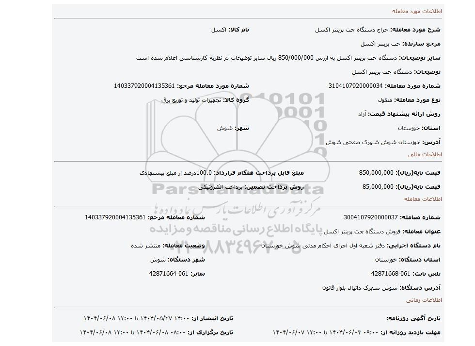 | عنوان آگهی: مزایده دستگاه جت پرینتر اکسل |