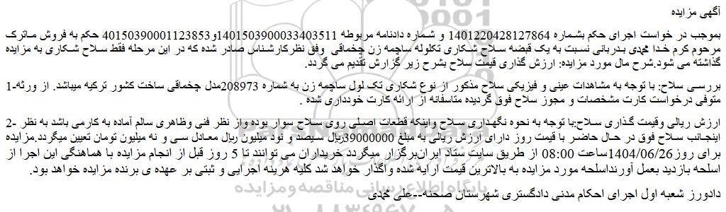 بموجب در خواست اجرای حکم بشماره 1401220428127864 و شماره دادنامه مربوطه 1401503900033403511و40150390001123853 حکم به فروش ماترک مرحوم کرم خدا محمدی بدربانی نسبت به یک قبضه سلاح شکاری تکلوله ساچمه زن چخماقی  وفق نظرکارشناس صادر شده که در این مرحله فقط سلاح شکاری به مزایده گذاشته می شود.شرح مال مورد مزایده: ارزش گذاری قیمت سلاح بشرح زیر گزارش تقدیم می گردد.
