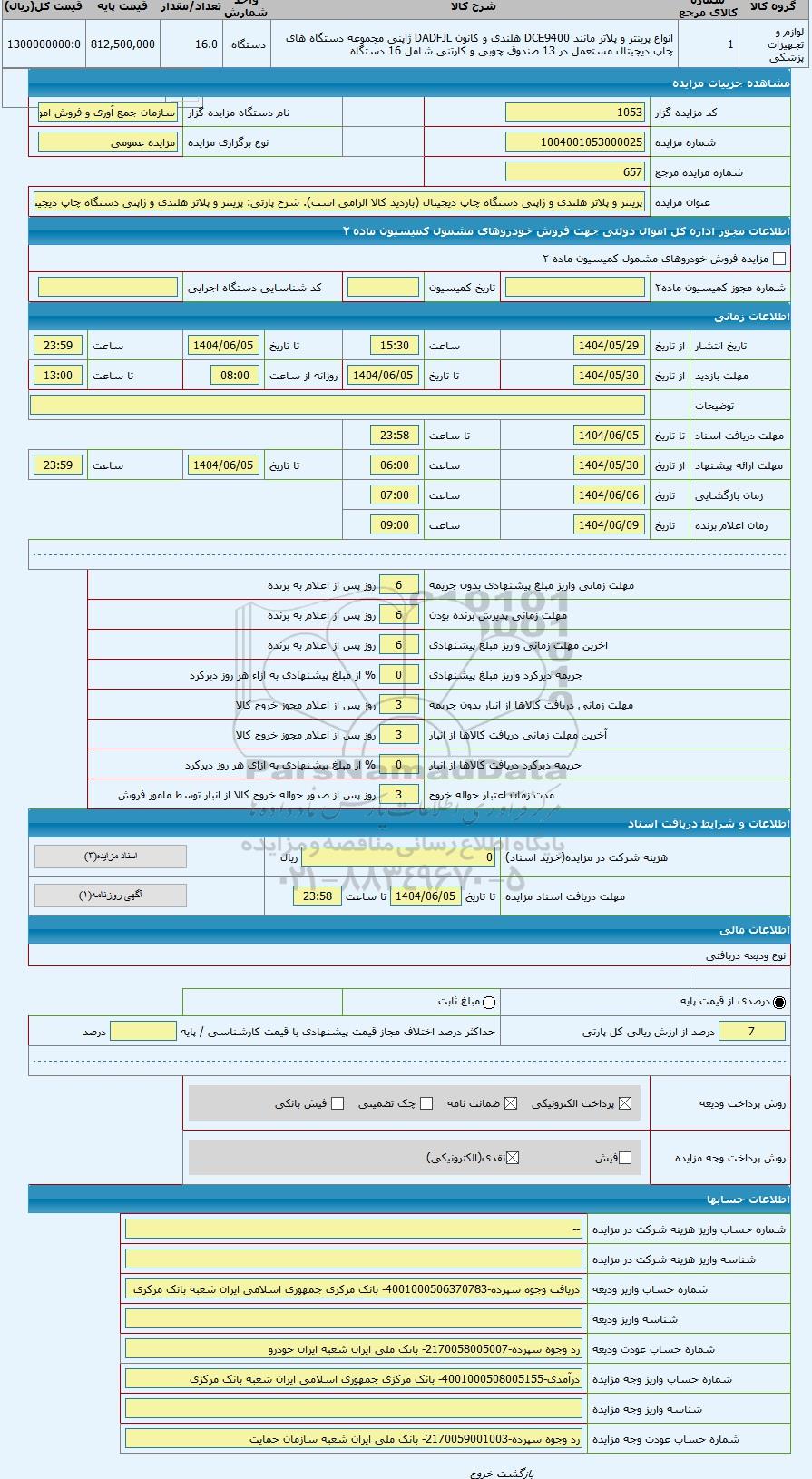 تلفن:5- 88349670 (021) فکس: 88349673 (021) Website: www.ParsNamadData.com E-mail: Info@ParsNamadData.com مزایده پرینتر و پلاتر هلندی و ژاپنی دستگاه چاپ دیجیتال (بازدید کالا الزامی است)
