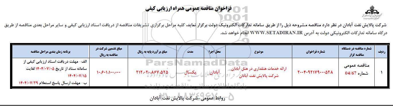 تلفن:5- 88349670 (021) فکس: 88349673 (021) Website: www.ParsNamadData.com E-mail: Info@ParsNamadData.com مناقصه ارائه خدمات هتلداری در هتل ...