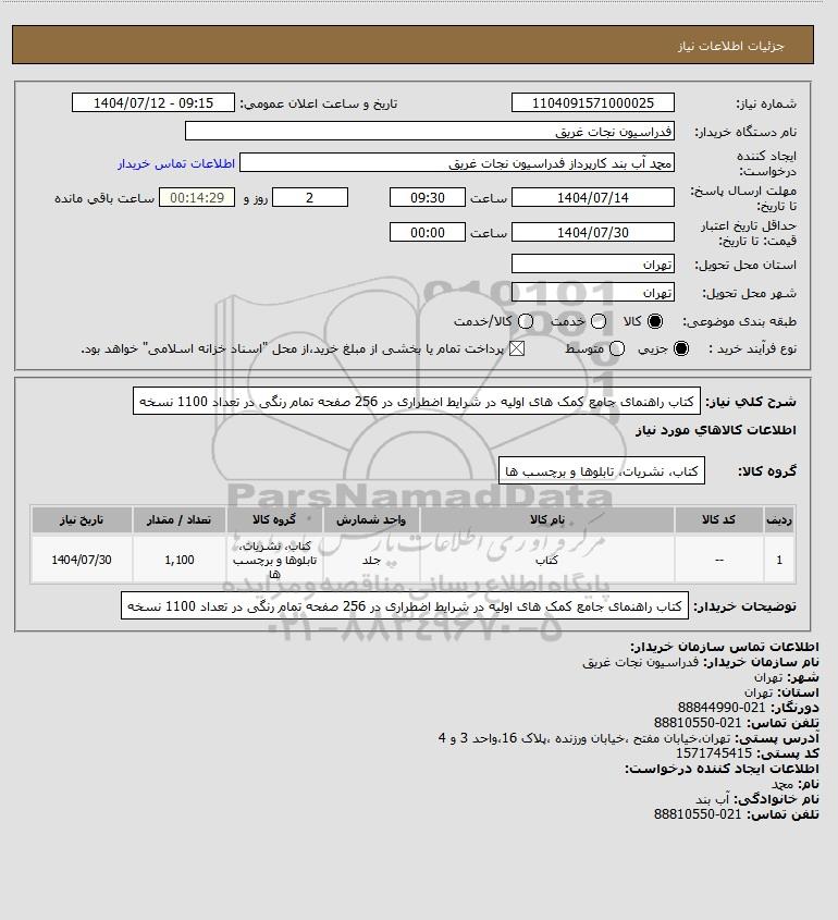 تلفن:5- 88349670 (021) فکس: 88349673 (021) Website: www.ParsNamadData.com E-mail: Info@ParsNamadData.com استعلام کتاب راهنمای جامع کمک های اولیه در شرایط اضطراری در 256 صفحه تمام رنگی در تعداد 1100 نسخه
