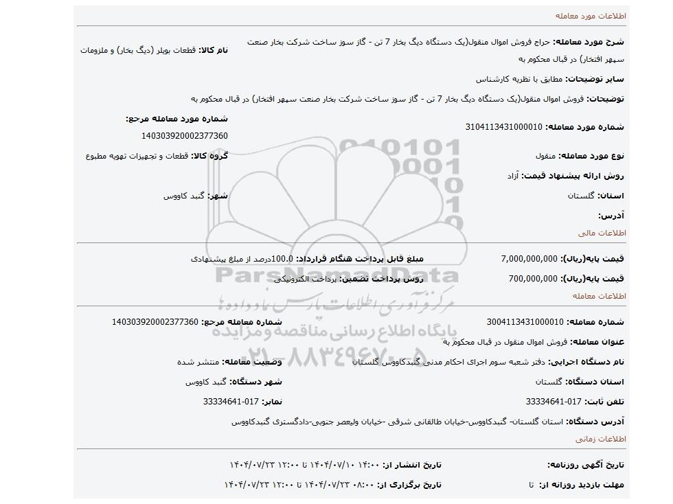 | عنوان آگهی: مزایده فروش اموال منقول(یک دستگاه دیگ بخار 7 تن - گاز سوز ساخت شرکت بخار صنعت سپهر افتخار) در قبال محکوم به |