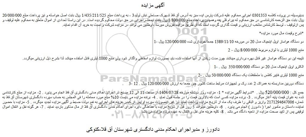 بدینوسیله در پرونده کلاسه 0301353 اجرایی محکوم علیه شرکت پارس ایده سبز به آدرس آق قلا شهرک صنعتی نبش تولید3 ، به پرداخت مبلغ 1/435/211/525 ریال بابت اصل خواسته و نیز پرداخت مبلغ 20/000/000 ریال بابت حق الزحمه کارشناسی در حق محکوم له بیرام قلی پقه وهمچنین پرداخت مبلغ 1/800/000 ریال بابت نیمعشراجرایی در حق دولت محکوم گردیده است. در این راستا تعدادی از اموال متعلق به محکوم علیه توقیف و پس ازتوقیف ، توسط کارشناس منتخب ارزیابی و قیمت گذاری گردیده است که از طریق مزایده بفروش میرسد داوطلبین می توانند در مزایده شرکت و نسبت به خرید آن اقدام نمایند.