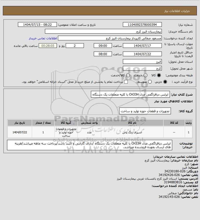 تلفن:5- 88349670 (021) فکس: 88349673 (021) Website: www.ParsNamadData.com E-mail: Info@ParsNamadData.com استعلام ایرلس دیافراگمی مدل CH33H با کلیه متعلقات یک دستگاه