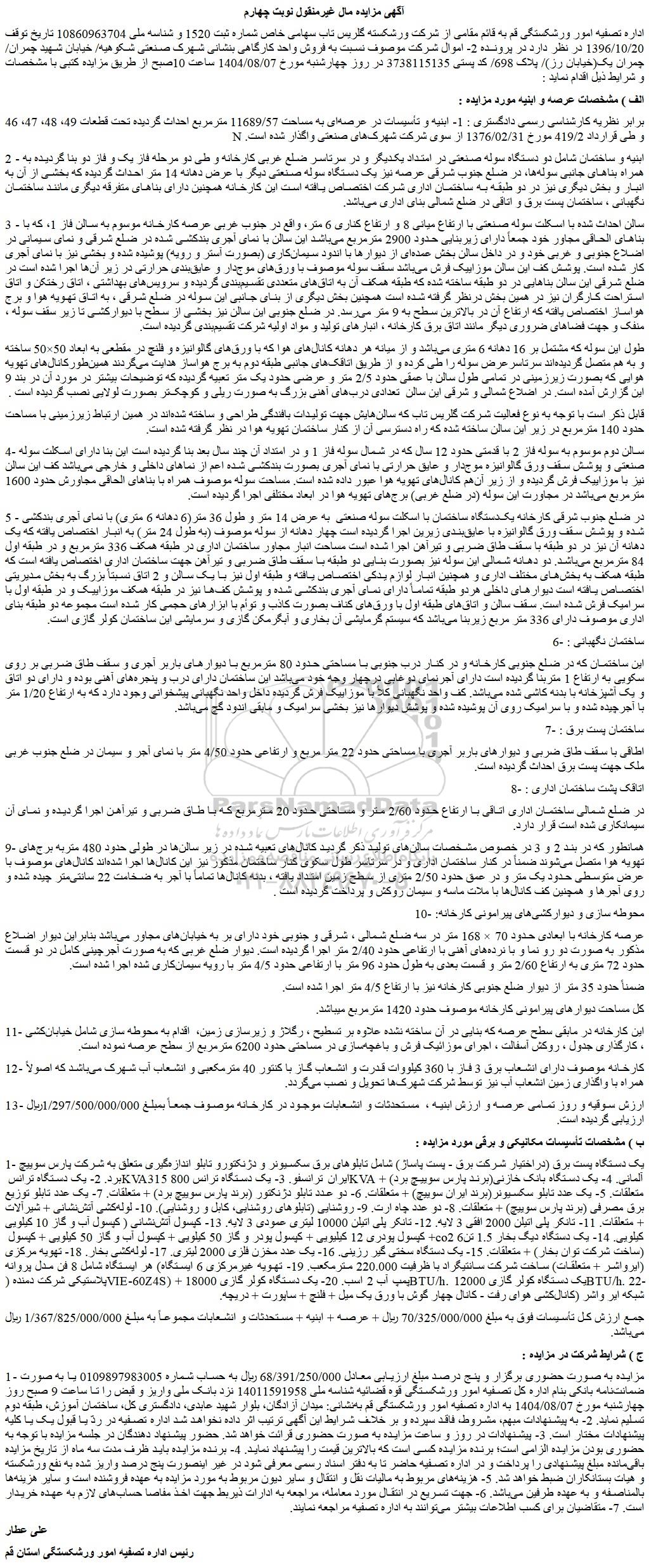 اداره تصفیه امور ورشکستگی قم به قائم مقامی از شرکت ورشکسته گلریس تاب سهامی خاص شماره ثبت 1520 و شناسه ملی 10860963704 تاریخ توقف 1396/10/20 در نظر دارد در پرونده 2- اموال شرکت موصوف نسبت به فروش واحد کارگاهی بنشانی شهرک صنعتی شکوهیه/ خیابان شهید چمران/ چمران یک(خیابان رز)/ پلاک 698/ کد پستی 3738115135 در روز چهارشنبه مورخ 1404/08/07 ساعت 10صبح از طریق مزایده کتبی با مشخصات و شرایط ذیل اقدام نماید :