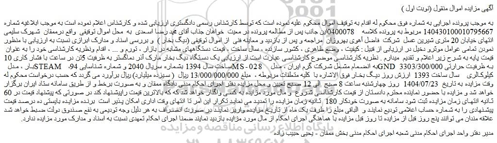 به موجب پرونده اجرایی به شماره فوق محکوم له اقدام به توقیف اموال محکوم علیه نموده است که توسط کارشناس رسمی دادگستری ارزیابی شده و کارشناس اعلام نموده است به موجب ابلاغیه شماره 140430100010795667 مربوط به پرونده کلاسه 0400078این جانب پس از مطالعه پرونده در معیت خواهان جناب آقای محمد رضا اسعدی به محل اموال توقیفی واقع درممقان شهرک سلیمی انتهای خیابان 20 متری شیرین عسل شرکت فاضل آهوی بهروزان مراجعه و پس از بازدید و معاینه فنی از اموال توقیفی (دیگ بخار ) و بررسی اسناد و مدارک ابرازی نسبت به ارزیابی با منظور نمودن تمامی عوامل موثرو دخیل در ارزیابی از قبیل : کیفیت ، وضع ظاهری ، کشور سازنده ، سال ساخت ، قیمت دستگاههای مشابه در بازار ، تورم و ... ، اقدام ونظریه کارشناسی خود را به عنوان قیمت پایه به شرح زیر اعلام و تقدیم میدارم . نظریه کارشناسی موضوع کارشناسی عبارت است از ارزیابی یک دستگاه دیگ بخار مارک آذر دماگستر به ظرفیت 5تن در ساعت با فشار کاری 10 بار ، مدل steam ، ساخت سال 1394 بشماره سریال 2040 و شماره شناسایی 94ms-028 به انضمام مشعل شرکت گرم ایران ، مدل gnd 330 به ظرفیت حرارتی 3/300/000 کیلوکالری سال ساخت 1393 ارزش روز دیگ بخار فوق الاشاره با کلیه متعلقات مربوطه ، مبلغ 13/000/000/000 ریال ( سیزده میلیارد) ریال برآورد می گردد که حسب درخواست محکوم له وقت مزایده به تاریخ 1404/07/23 روز چهارشنبه ساعت 8 صبح الی 12 صبح تعیین و محل مزایده دفتر اجرای احکام مدنی دادگاه ممقان و به صورت برخط و از طریق سامانه ستاد ایران برگزار خواهد شد و مزایده با حضور نماینده محترم دادستان از قیمت کارشناسی شروع و مال مورد مزایده به کسی واگذار خواهد شد که که بالاترین قیمت راپیشنهاد کند در صورتی که پیشنهاد قیمت در 60 ثانیه انتهای زمان مزایده ثبت شود سامانه به صورت خودکار 180 ثانیه زمان مزایده را تمدید می نماید تکرار این امر تا انتهای وقت اداری امکان پذیر است برنده مزایده بایستی ده درصد قیمت پیشنهادی را به شماره حساب اعلامی تودیع نمایند و الباقی مبلغ را ظرف یک ماه از تاریخ مزایده واریز نمایند در صورت انصراف به هر دلیل وجه تودیعی به نفع صندوق دولت ضبط خواهد شد علاقه مندان می توانند پنج روز قبل از مزایده تا روز قبل مزایده با هماهنگی اجرای احکام از مال مورد مزایده بازدید نمایند ضمنا اجرای احکام تعهدی نسبت به اسناد و مدارک مورد مزایده ندارد.