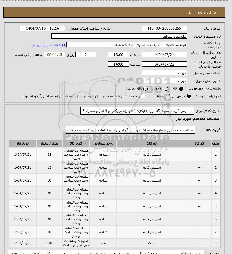 تلفن:5- 88349670 (021) فکس: 88349673 (021) Website: www.ParsNamadData.com E-mail: Info@ParsNamadData.com استعلام اسپیس فریم ( نمایشگاهی) با آبکاری گالوانیزه پر رکاب و قطر و و مسوار 5