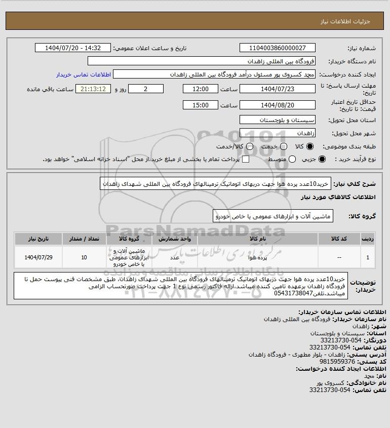 شرح کلی نیاز: خرید10عدد پرده هوا جهت دربهای اتوماتیک ترمینالهای فرودگاه بین المللی شهدای زاهدان