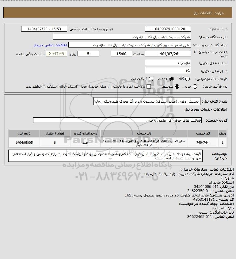 تلفن:5- 88349670 (021) فکس: 88349673 (021) Website: www.ParsNamadData.com E-mail: Info@ParsNamadData.com استعلام پوشش دهی (متال اسپری) پیستون راد بزرگ محرک هیدرولیکی وزل