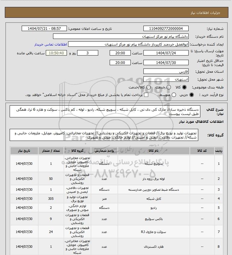 تلفن:5- 88349670 (021) فکس: 88349673 (021) Website: www.ParsNamadData.com E-mail: Info@ParsNamadData.com استعلام دستگاه ذخیره سازی مارک کی دی تی کابل شبکه سوییچ شبکه رادیو لوله کم باکس سوکت و هارد 6 ترا همگی طبق لیست پیوست