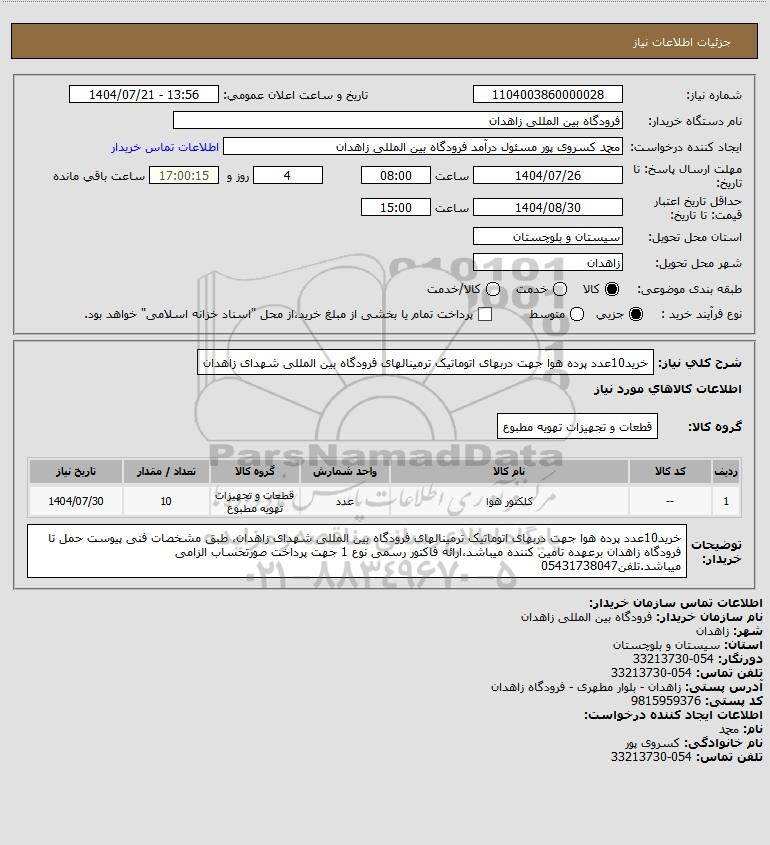 تلفن:5- 88349670 (021) فکس: 88349673 (021) Website: www.ParsNamadData.com E-mail: Info@ParsNamadData.com استعلام خرید10عدد پرده هوا جهت دربهای اتوماتیک ترمینالهای فرودگاه بین المللی شهدای زاهدان