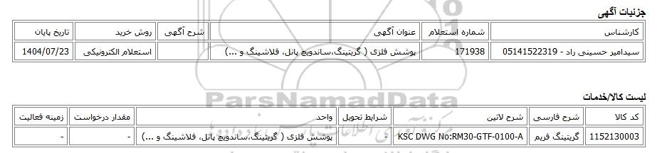 استعلام الکترونیکی پوشش فلزی ( گریتینگساندویچ پانل فلاشینگ و ...)