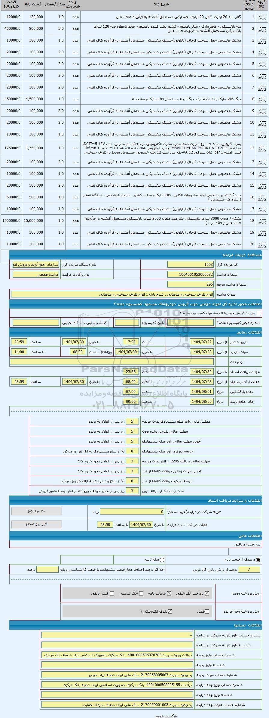 | | شماره مزایده مرجع | 295 | | | | | عنوان مزایده | انواع ظروف سوختی و ضایعاتی |