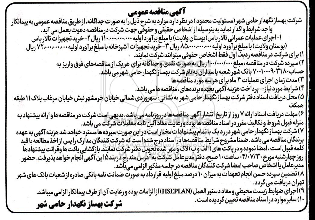 شرکت بهساز نگهدار حامی شهر (مسئولیت محدود) در نظر دارد موارد به شرح ذیل را به صورت جداگانه از طریق مناقصه عمومی به پیمانکار واجد شرایط واگذار نماید بدینوسیله از اشخاص حقیقی و حقوقی جهت شرکت در مناقصه دعوت بعمل می آید.