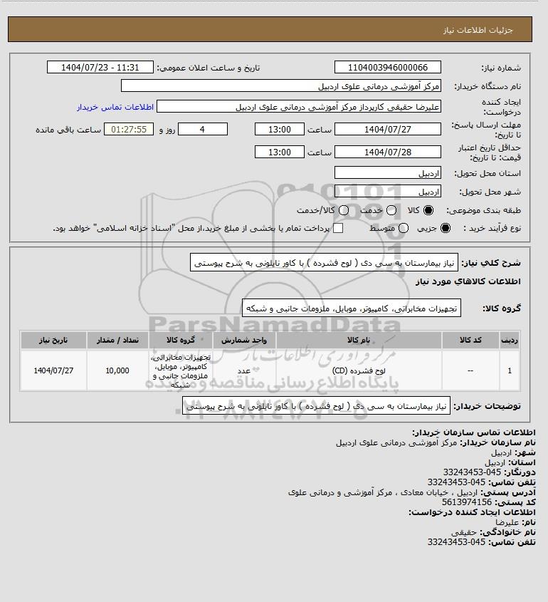 تلفن:5- 88349670 (021) فکس: 88349673 (021) Website: www.ParsNamadData.com E-mail: Info@ParsNamadData.com استعلام نیاز بیمارستان به سی دی ( لوح فشرده ) با کاور نایلونی به شرح پیوستی