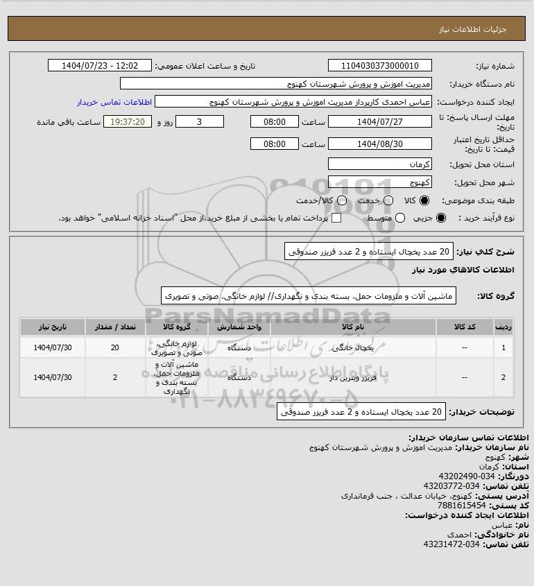 تلفن:5- 88349670 (021) فکس: 88349673 (021) Website: www.ParsNamadData.com E-mail: Info@ParsNamadData.com استعلام 20 عدد یخچال ایستاده و 2 عدد فریزر صندوقی