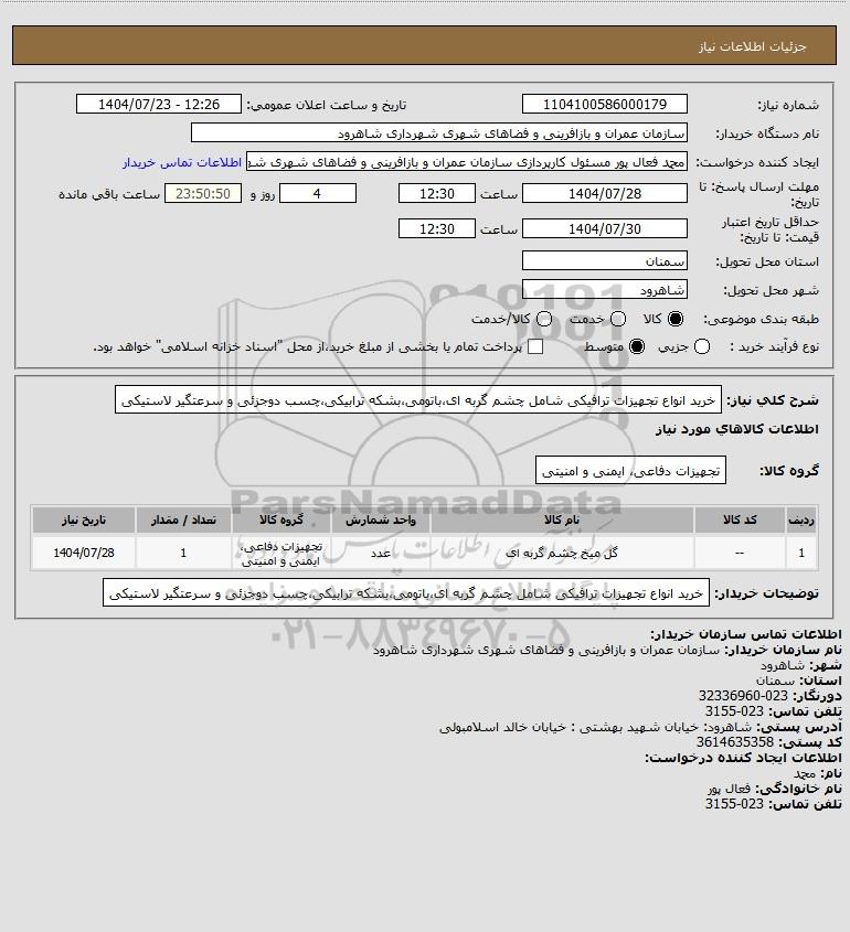 تلفن:5- 88349670 (021) فکس: 88349673 (021) Website: www.ParsNamadData.com E-mail: Info@ParsNamadData.com استعلام خرید انواع تجهیزات ترافیکی شامل چشم گربه ایباتومیبشکه ترابیکیچسب دوجزئی و سرعتگیر لاستیکی