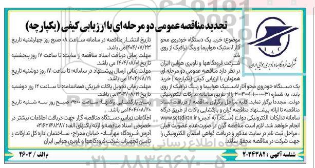 | عنوان آگهی: تجدید مناقصه خرید یک دستگاه خودروی محو آثار لاستیک هواپیما و رنگ ترافیک از روی باند |