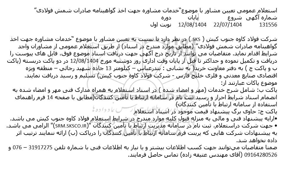 شرکت فولاد کاوه جنوب کیش ( SKS ) در نظر دارد تا نسبت به تعیین مشاور با موضوع “خدمات مشاوره جهت اخذ گواهینامه صادرات شمش فولادی” (مطابق موارد مندرج در اسناد) از طریق استعلام عمومی از مشاوران واجد شرایط اقدام نماید. متقاضیان می توانند از تاریخ درج آگهی جهت دریافت اسناد موضوع فوق، فایل های پیوست را دریافت و تکمیل نموده و حداکثر تا قبل از پایان وقت اداری روز دوشنبه مورخ 1404/08/12 در دو پاکت دربسته (پاکت ب و پاکت ج ) به دفتر معاونت خرید( به نشانی : بندرعباس – کیلومتر 13 جاده شهید رجائی – منطقه ویژه اقتصادی صنایع معدنی و فلزی خلیج فارس - شرکت فولاد کاوه جنوب کیش) تسلیم و رسید دریافت نمایند.