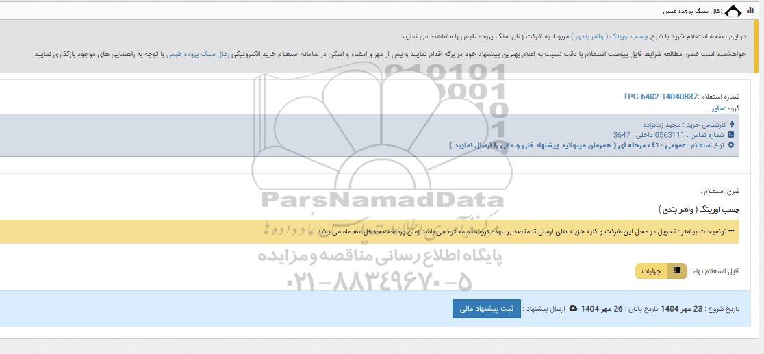 تلفن:5- 88349670 (021) فکس: 88349673 (021) Website: www.ParsNamadData.com E-mail: Info@ParsNamadData.com استعلام چسب اورینگ (وارشربندی)