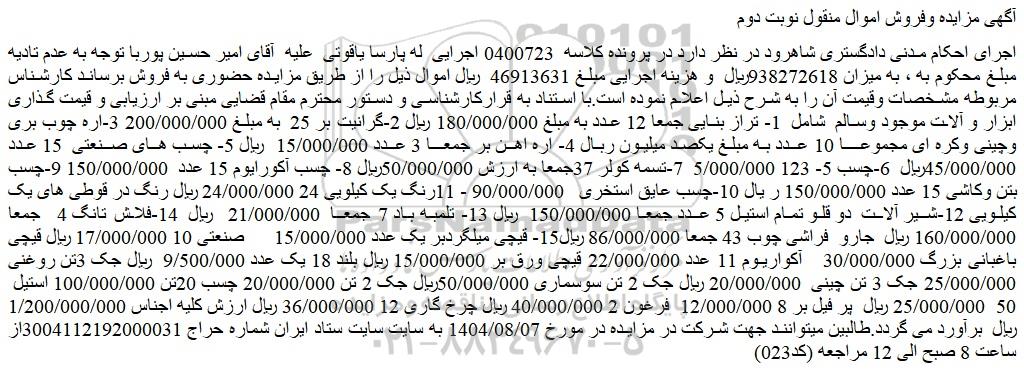 اجرای احکام مدنی دادگستری شاهرود در نظر دارد در پرونده کلاسه 0400723 اجرایی له پارسا یاقوتی علیه آقای امیر حسین پوربا توجه به عدم تادیه مبلغ محکوم به ، به میزان 938272618ریال و هزینه اجرایی مبلغ 46913631 ریال اموال ذیل را از طریق مزایده حضوری به فروش برساند کارشناس مربوطه مشخصات وقیمت آن را به شرح ذیل اعلام نموده است.با استناد به قرارکارشناسی و دستور محترم مقام قضایی مبنی بر ارزیابی و قیمت گذاری ابزار و آلات موجود وسالم شامل 1- تراز بنایی جمعا 12 عدد به مبلغ 180/000/000 ریال 2-گرانیت بر 25 به مبلغ 200/000/000 3-اره چوب بری وچینی وکره ای مجموعا 10 عدد به مبلغ یکصد میلیون ربال 4- اره اهن بر جمعا 3 عدد 15/000/000 ریال 5- چسب های صنعتی 15 عدد 45/000/000ریال 6-چسب 5- 123 5/000/000 7-تسمه کولر 37جمعا به ارزش 50/000/000ریال 8- چسب آکورایوم 15 عدد 150/000/000 9-چسب بتن وکاشی 15 عدد 150/000/000 ر یال 10-چسب عایق استخری 90/000/000 - 11رنگ یک کیلویی 24 24/000/000 ریال رنگ در قوطی های یک کیلویی 12-شیر آلات دو قلو تمام استیل 5 عدد جمعا 150/000/000 ریال 13- تلمبه باد 7 جمعا 21/000/000 ریال 14-فلاش تانگ 4 جمعا 160/000/000 ریال جارو فراشی چوب 43 جمعا 86/000/000 ریال15- قیچی میلگردبر یک عدد 15/000/000 صنعتی 10 17/000/000 ریال قیچی باغبانی بزرگ 30/000/000 آکواریوم 11 عدد 22/000/000 قیچی ورق بر 15/000/000 ریال بلند 18 یک عدد 9/500/000 ریال جک 3تن روغنی 25/000/000 جک 3 تن چینی 20/000/000 ریال جک 2 تن سوسماری 50/000/000ریال جک 2 تن 20/000/000 چسب 20تن 100/000/000 استیل 50 25/000/000 ریال پر فیل بر 8 12/000/000 فرغون 2 40/000/000 ریال چرخ گاری 12 36/000/000 ریال ارزش کلیه اجناس 1/200/000/000 ریال برآورد می گردد.طالبین میتوانند جهت شرکت در مزایده در مورخ 1404/08/07 به سایت سایت ستاد ایران شماره حراج 3004112192000031از ساعت 8 صبح الی 12 مراجعه (کد023)