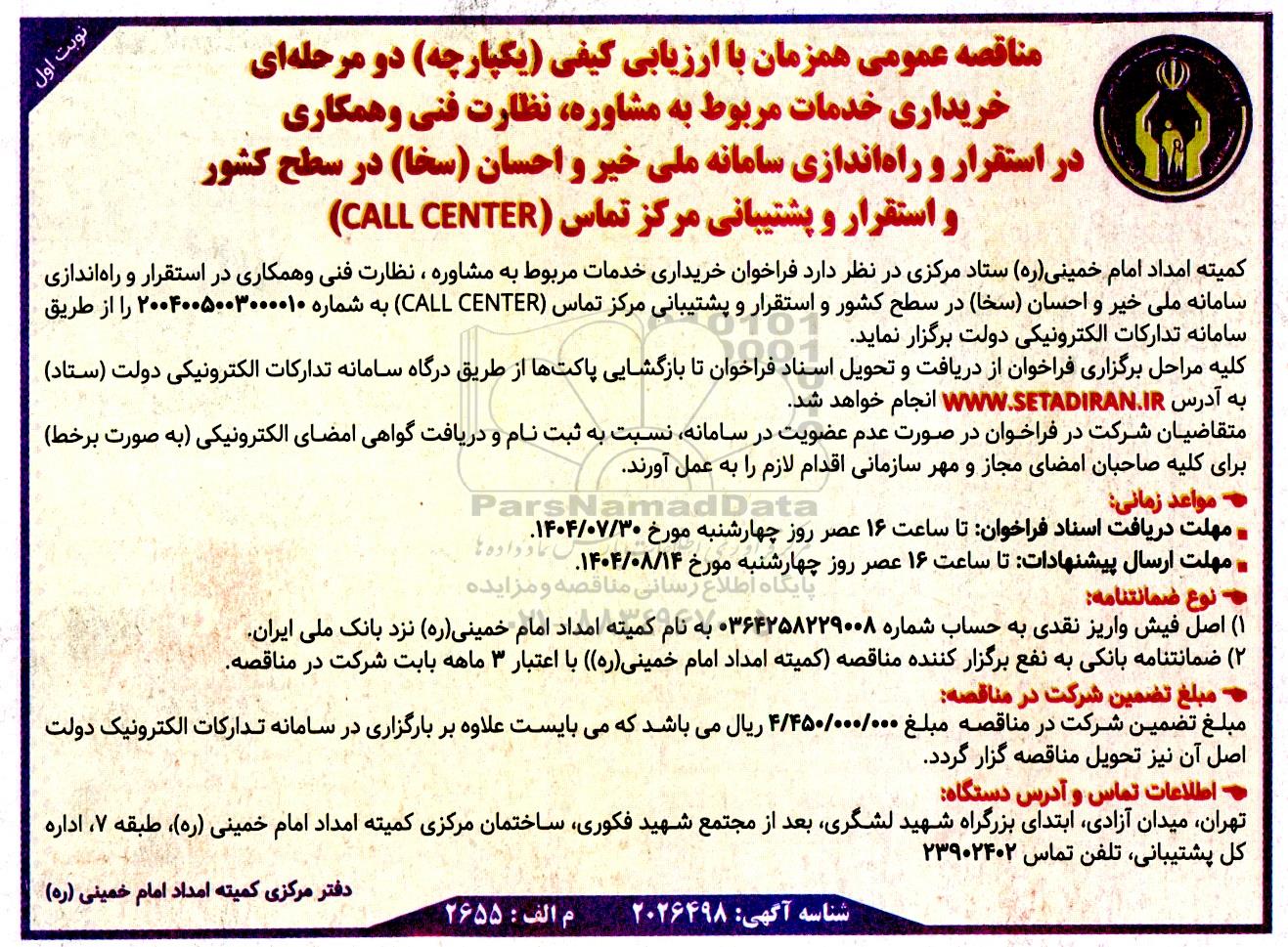 کمیته امداد امام خمینی (ره) ستاد مرکزی در نظر دارد فراخوان خریداری خدمات مربوط به مشاوره، نظارفت فنی و همکاری در استقرار و راه اندازی سامانه ملی خیر و احسان (سخا) در سطح کشور و استقرار و پشتیبانی مرکز تماس (CALL CENTER) به شماره 2004005003000010 را از طریق سامانه تدارکات الکترونیکی دولت برگزار نماید.