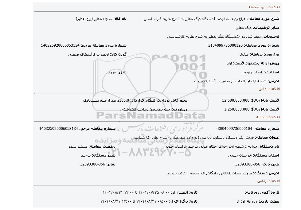| عنوان آگهی: مزایده ردیف شانزده -1دستگاه دیگ تقطیر به شرح نظریه کارشناسی |