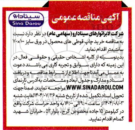 تلفن:5- 88349670 (021) فکس: 88349673 (021) Website: www.ParsNamadData.com E-mail: Info@ParsNamadData.com مناقصه خرید چاپ قوطی های محصول در ورق سایز 100*70