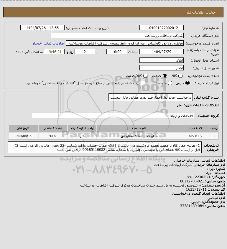 تلفن:5- 88349670 (021) فکس: 88349673 (021) Website: www.ParsNamadData.com E-mail: Info@ParsNamadData.com استعلام درخواست خرید نوار اخطار فیبر نوری مطابق فایل پیوست