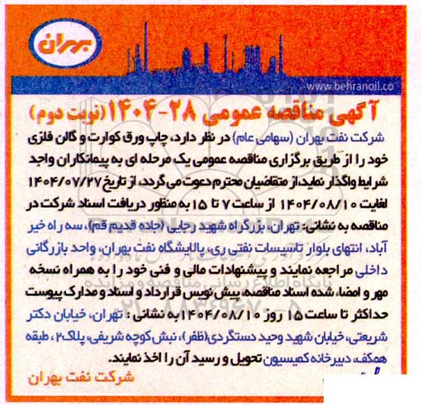 تلفن:5- 88349670 (021) فکس: 88349673 (021) Website: www.ParsNamadData.com E-mail: Info@ParsNamadData.com مناقصه چاپ ورق کوارت و گالن فلزی- نوبت دوم