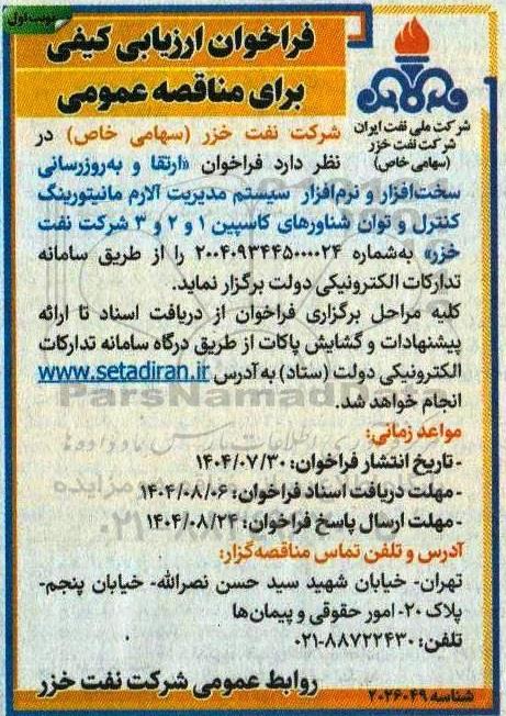 تلفن:5- 88349670 (021) فکس: 88349673 (021) Website: www.ParsNamadData.com E-mail: Info@ParsNamadData.com فراخوان ارزیابی کیفی ارتقا و به روزرسانی سخت افزار و نرم افزار سیستم مدیریت آلارم