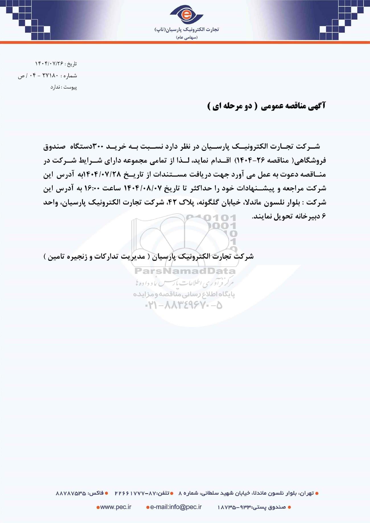 تلفن:5- 88349670 (021) فکس: 88349673 (021) Website: www.ParsNamadData.com E-mail: Info@ParsNamadData.com مناقصه عمومی خرید 300 دستگاه صندوق فروشگاهی