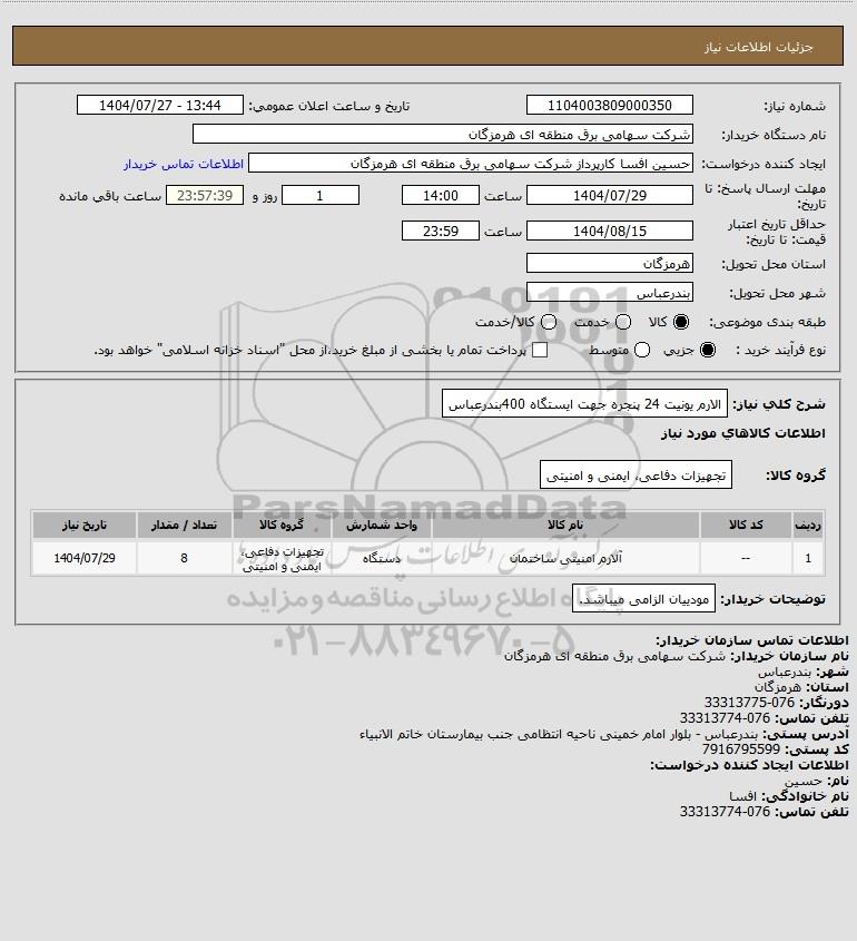 استعلام الارم یونیت 24 پنجره جهت ایستگاه 400بندرعباس