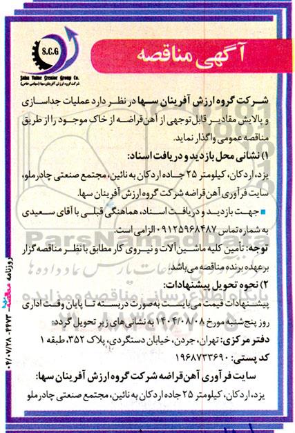 تلفن:5- 88349670 (021) فکس: 88349673 (021) Website: www.ParsNamadData.com E-mail: Info@ParsNamadData.com مناقصه عملیات جداسازی و پالایش مقادیر قابل توجهی از آهن قراضه از خاک موجود
